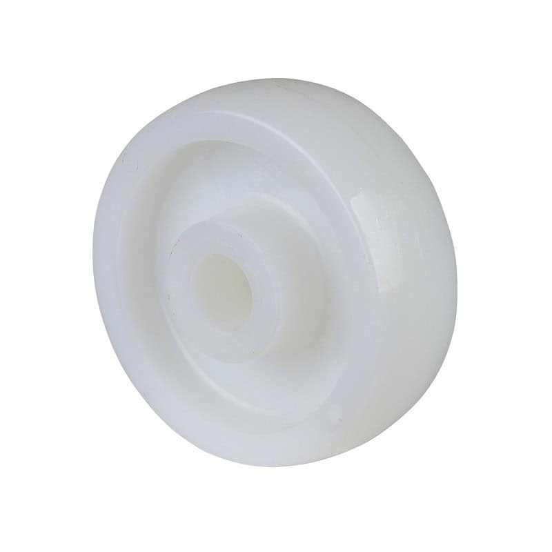 Kunststof hjul i hvid polyamid. Denne type hjul benyttes ofte i vådt miljø og hvor der ønskes mulighed for grundig rengøring.