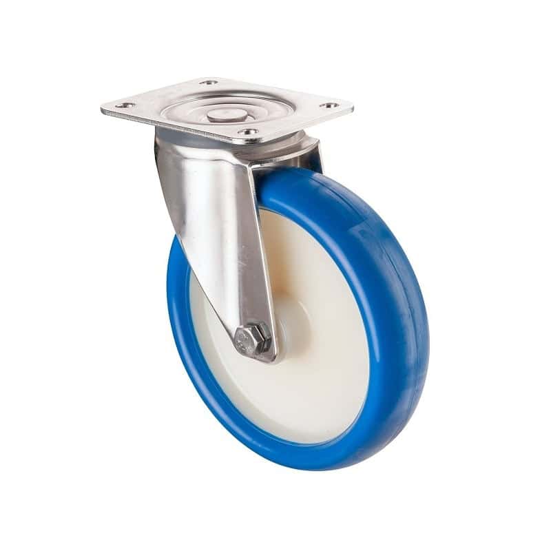 Rustfri 200 mm med blå polyuretan drejbar/plade maks. 300 kg.